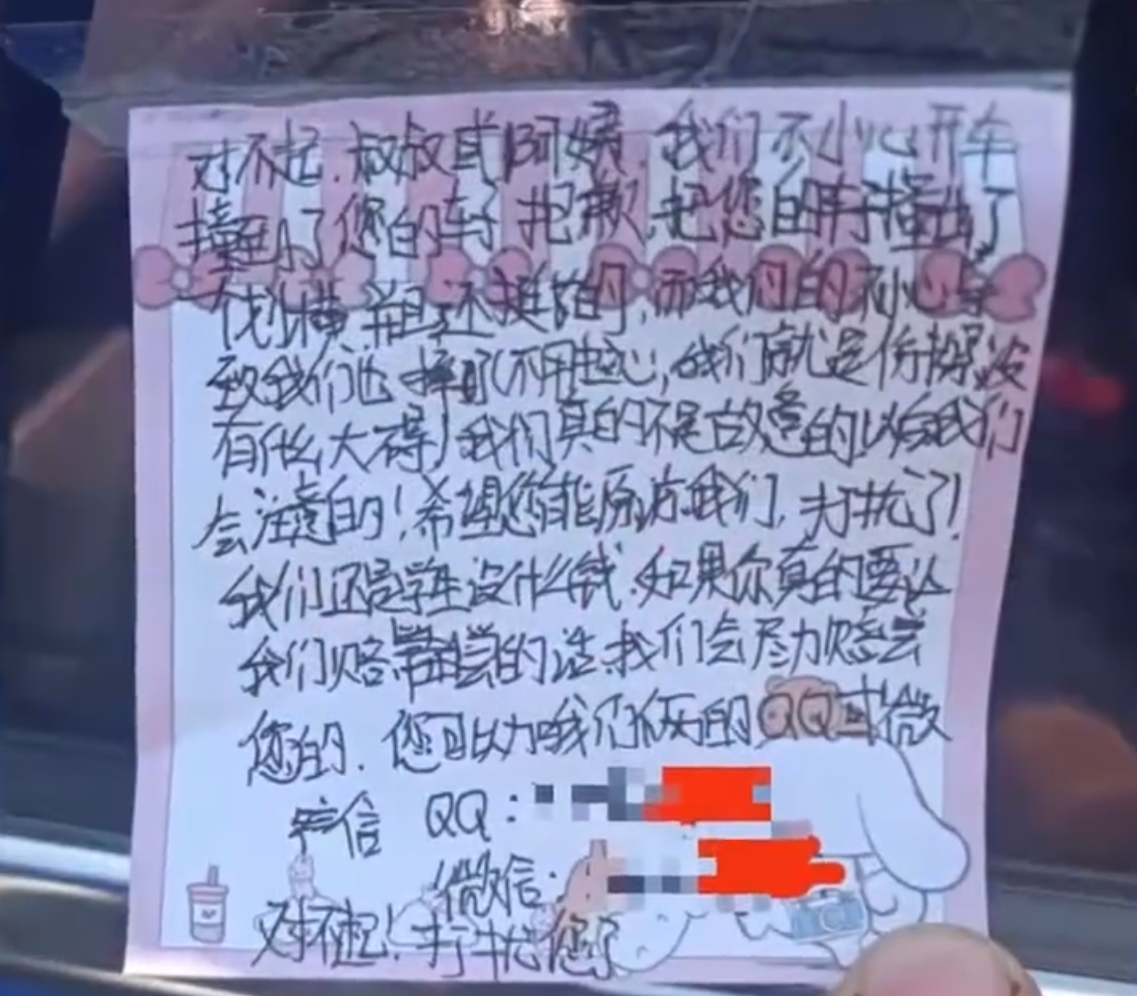 浙江丽水一名初中生骑车的时候不小心刮到了路边停放的车辆,若是面对这种场景,有些孩子可能会害怕家长惩罚而慌张逃跑,而该学生则给车主留下了小纸条道歉,同时还写下了自己的联系方式