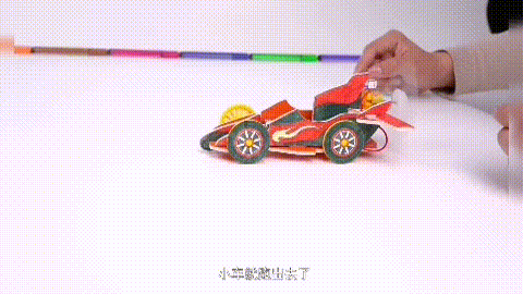 飞奔的猫:“我跑的很快,这是由于拉线压箱与轮子的结合,使弹性势能与动能相互转换,跟我比比看谁跑的更快吧!”