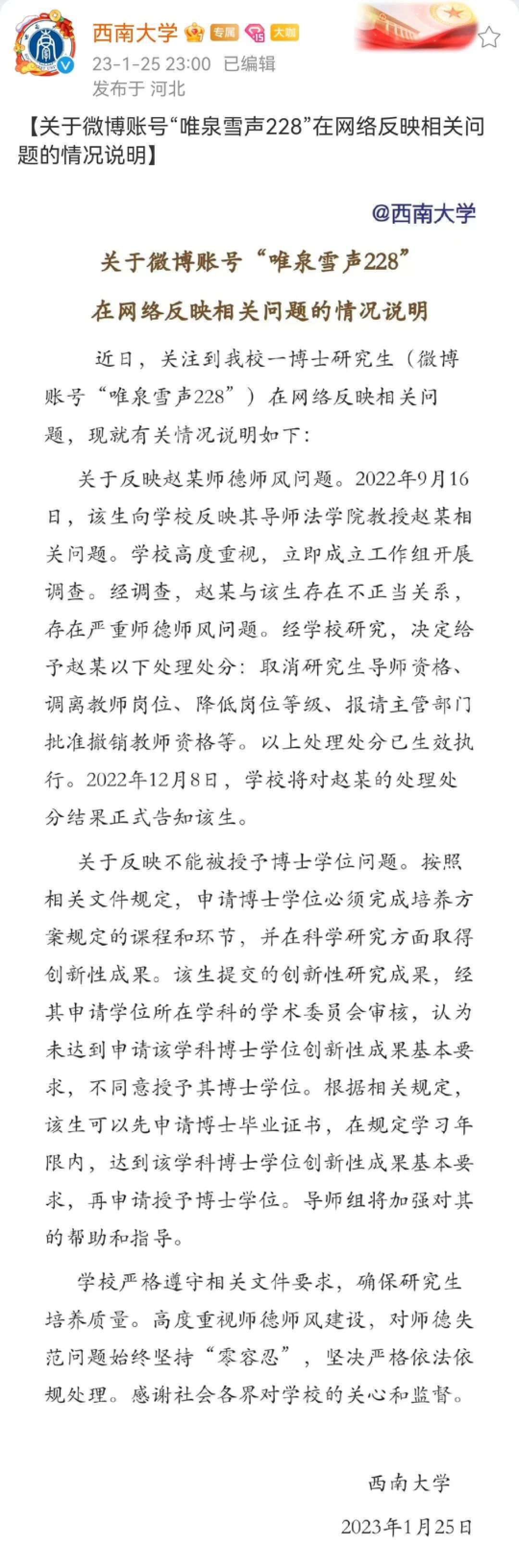 教授与博士生关系不当 西南大学通报